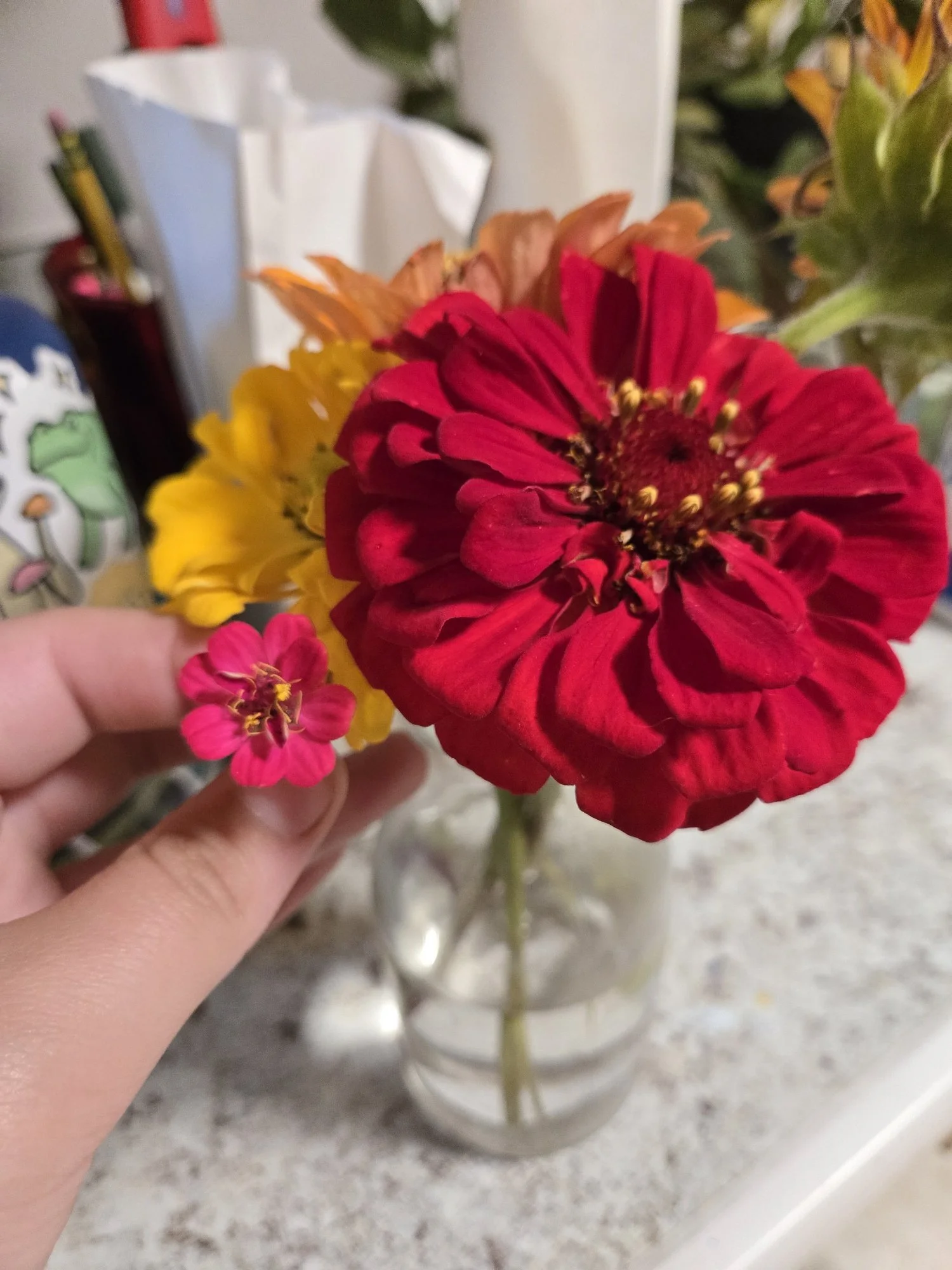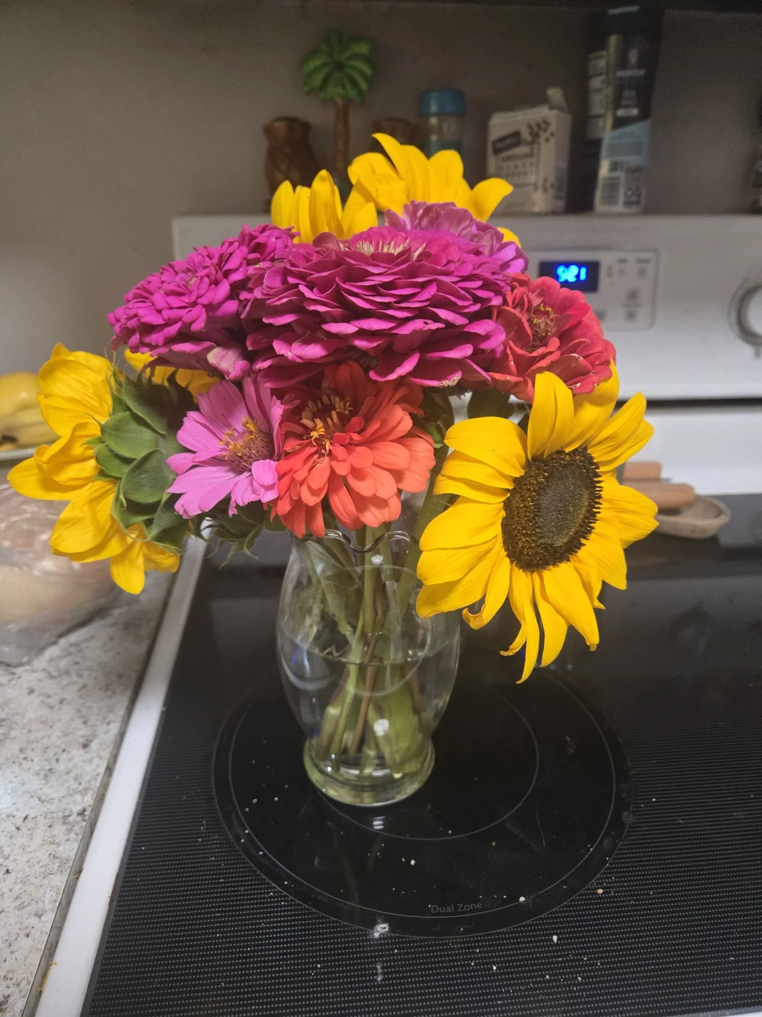 Bouquets that I’ve made with zinnias and sunflowers from my garden